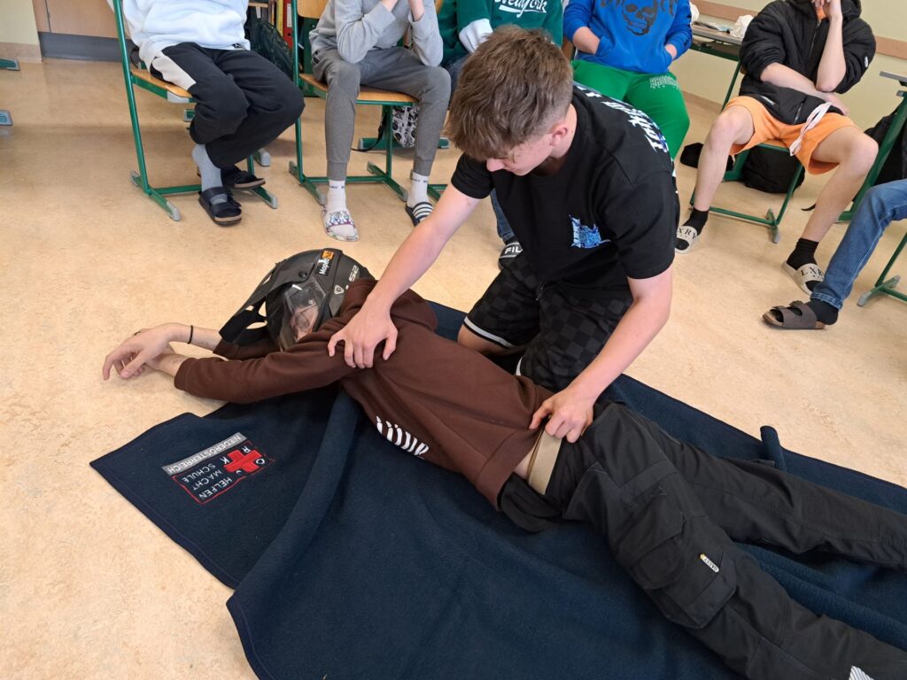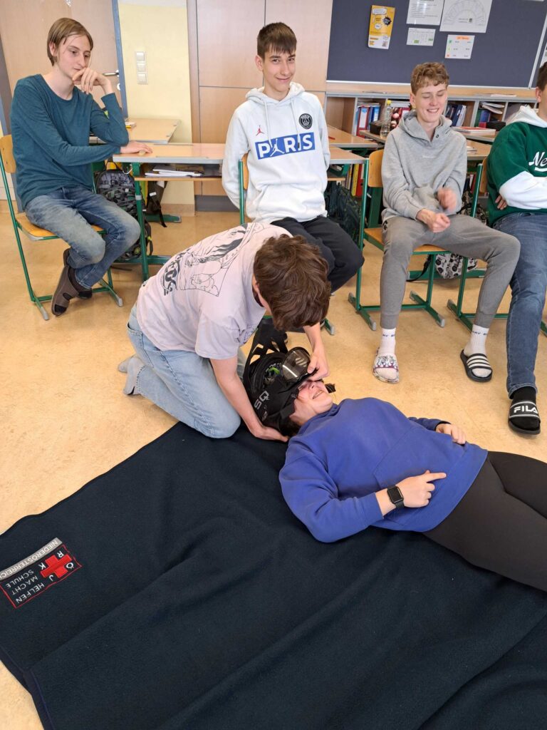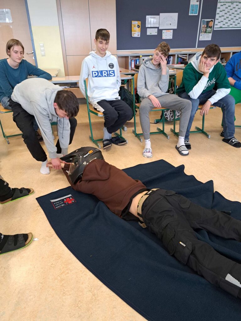 Da Frühlingszeit auch Mopedzeit an unserer Schule ist, beschäftigen sich unsere Schülerinnen und Schüler derzeit mit der Helmabnahme. Dazu gehören auch die Bewusstseinskontrolle, das Wegziehen von der Straße und das Umdrehen, damit die Abnahme des Helms überhaupt möglich ist.