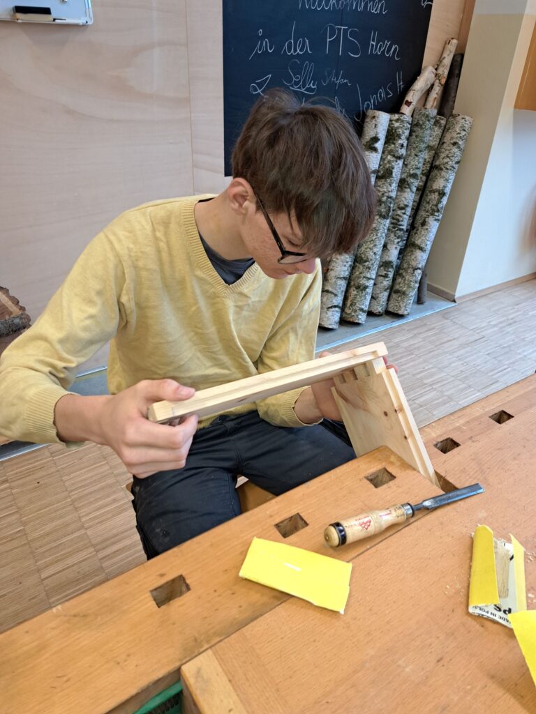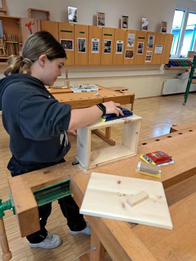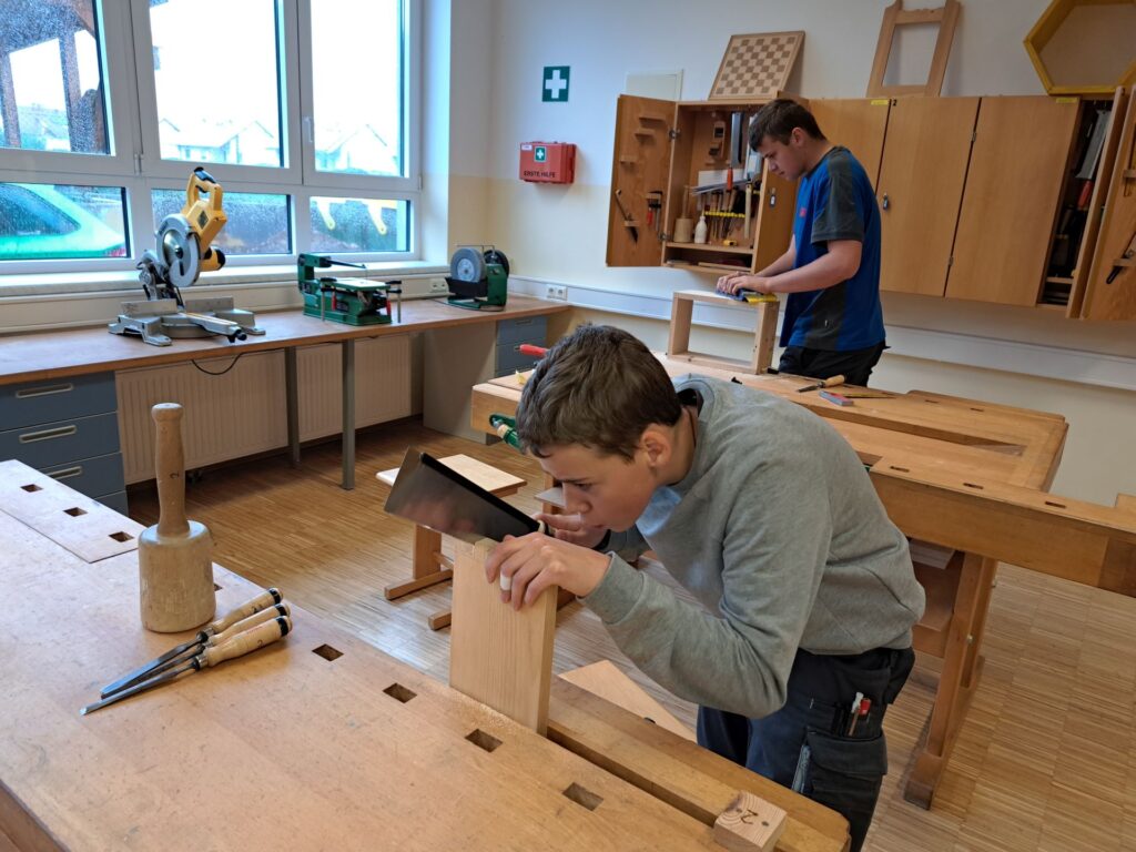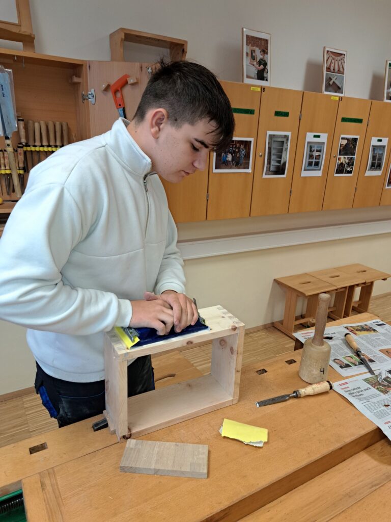 Fleißig wird an der Brotdose aus Zirbe gearbeitet. Viele Arbeitsschritte und vor allem Genauigkeit sind bis zur Fertigstellung notwendig. Alle SchülerInnen und Schüler sind mit Eifer bei der Sache.