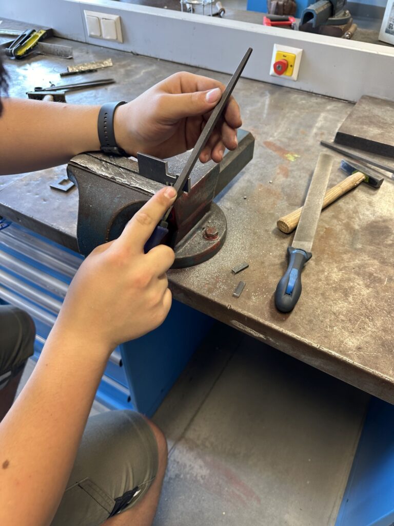 Die Grundfertigkeiten „Sägen“ und „Feilen“ sind bei diesem Werkstück essenziell. Der Umgang mit Feile und Säge ist eine wichtige Grundlage, die Schlosser, Metallbauer und Feinmechaniker erlernen müssen.