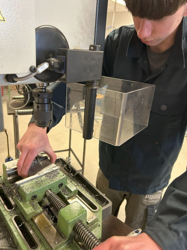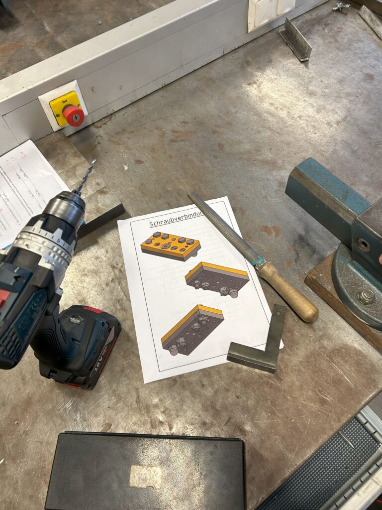 Die Schülerinnen und Schüler üben derzeit fleißig an diversesten Schraubverbindungen. Dazu gehören die Öffnungen unterschiedlich gebohrt (maschinell und manuell), Gewinde geschnitten, Durchgangsbohrungen oder Schraubsenkungen erstellt. Auf besonders sorgfältiges Arbeiten sollte immer geachtet werden.