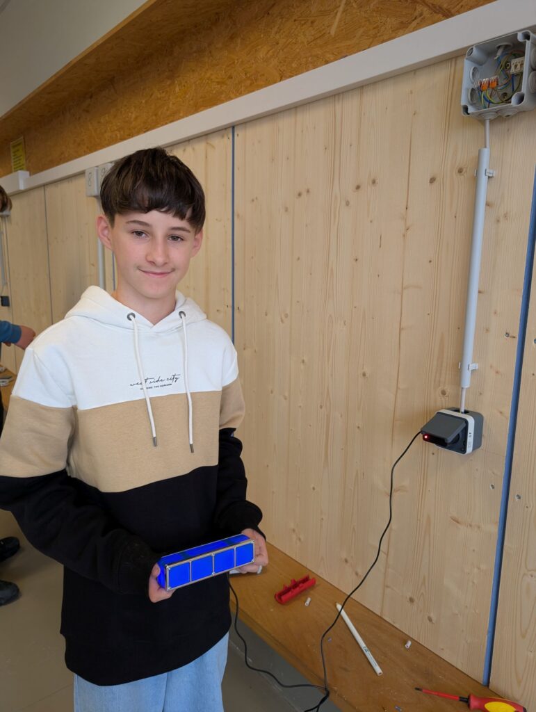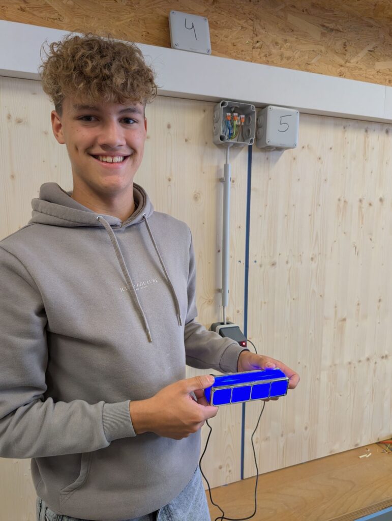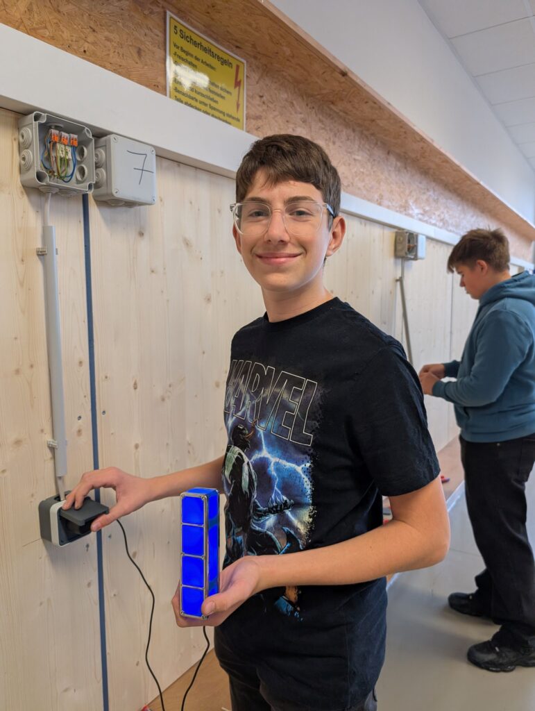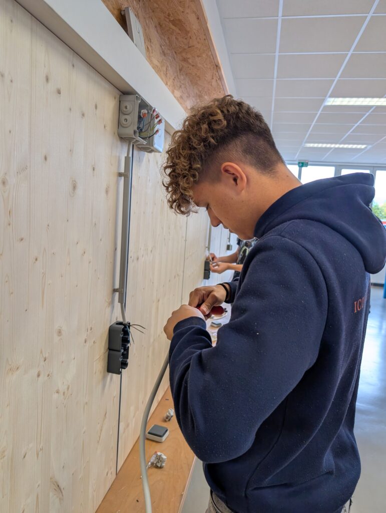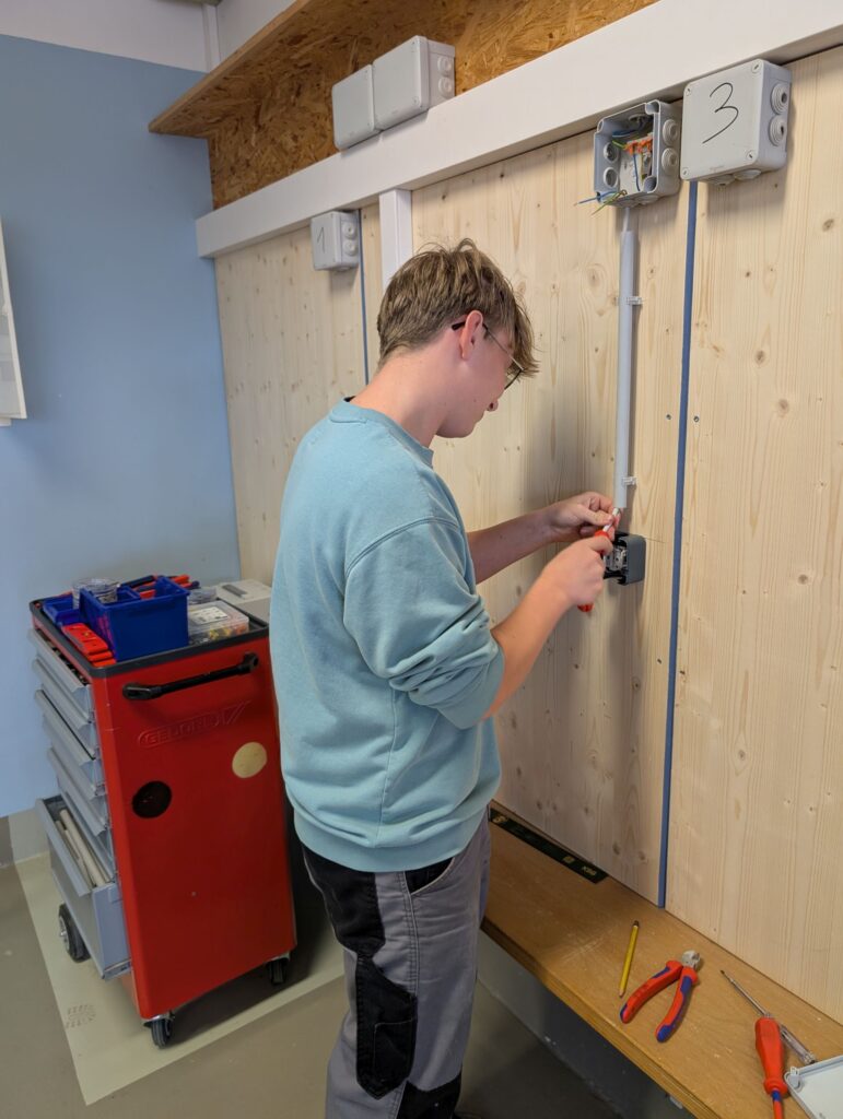 In der Fachpraxis installieren die angehenden Elektrotechniker und Mechatroniker in der Werkstätte an der Installationsübungswand gerade Aufputzsteckdosen und eine Ausschaltung. Wenn nach erfolgreicher Installation der Schaltung „ein Licht aufgeht“ und die Steckdose „Strom gibt“ ist die Freude sehr groß.