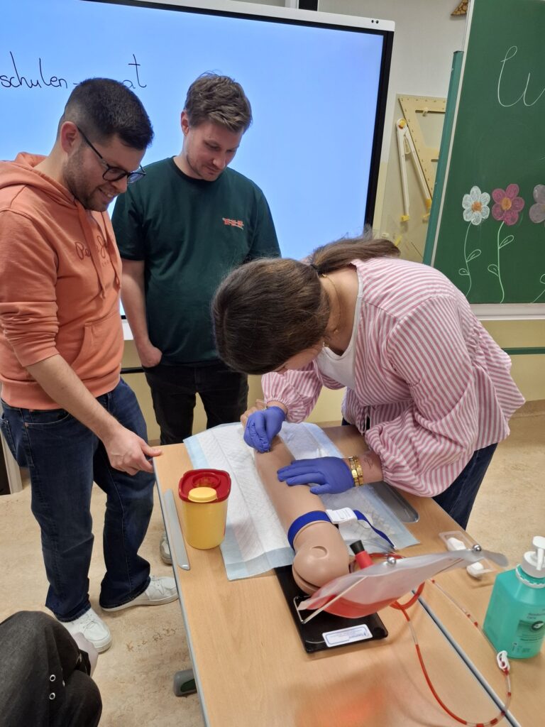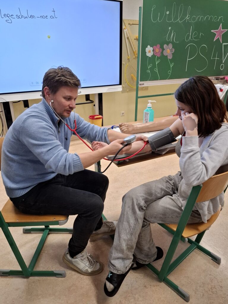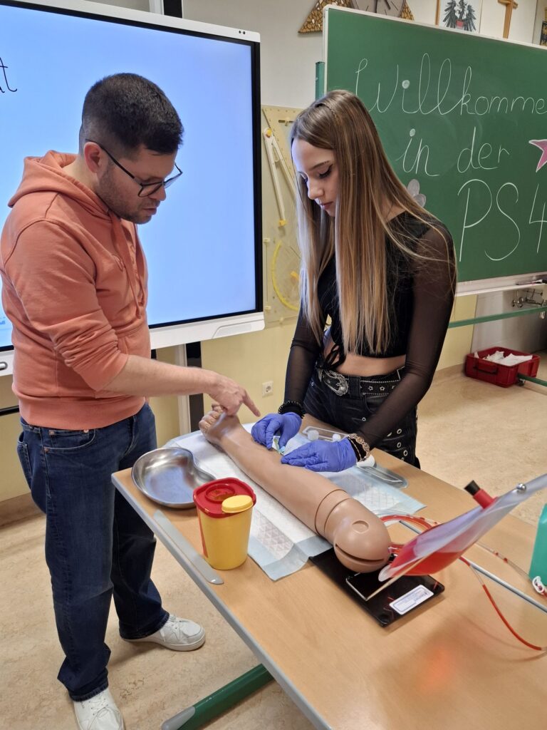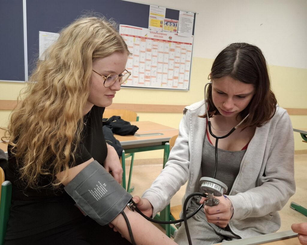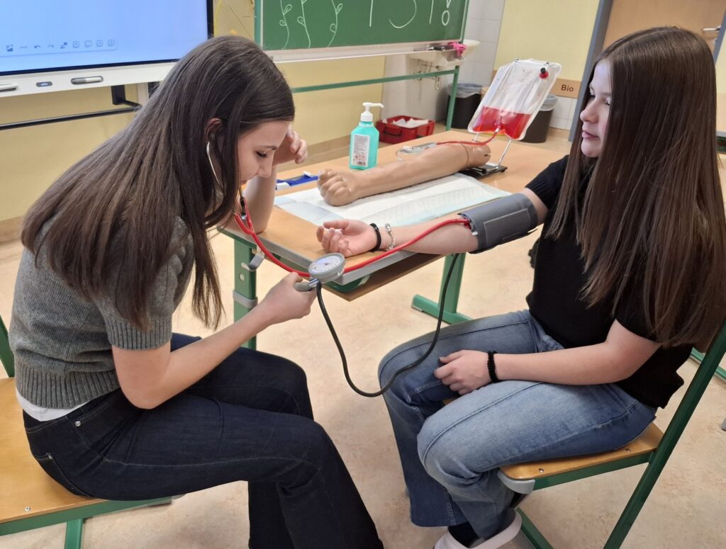 Im praktischen Teil lernten die Schülerinnen das Messen des Blutdrucks bzw. Pulses, aber auch das Abnehmen von Blut an einem Übungsarm.Wir bedanken uns sehr herzlich für den Besuch und den überaus abwechslungsreichen und spannenden Nachmittag.