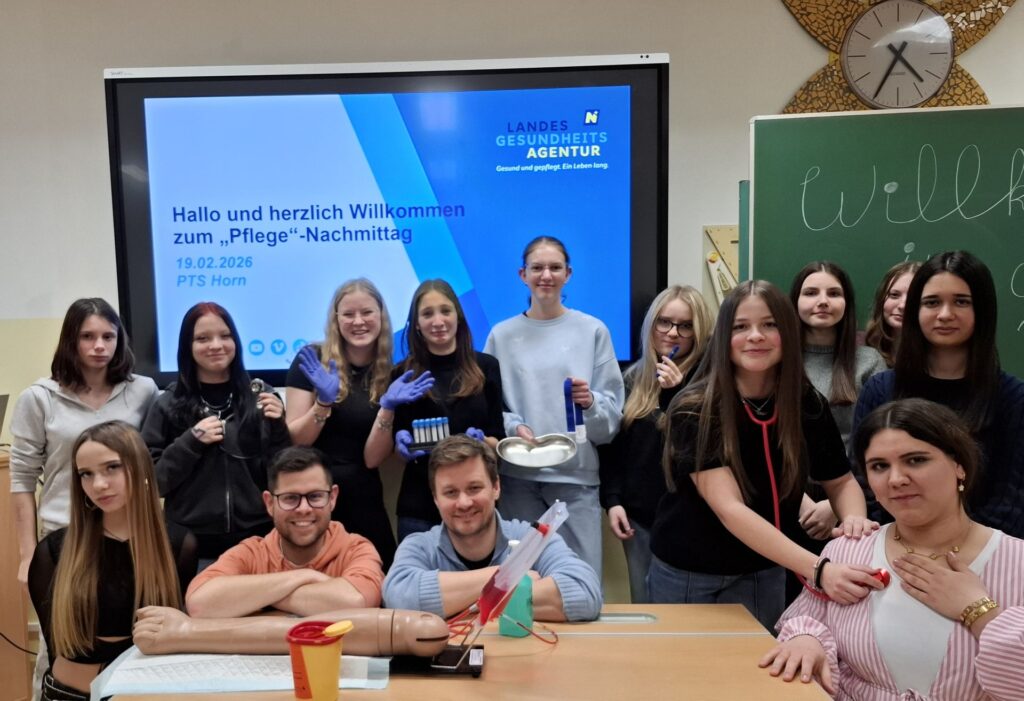 Vorige Woche durften wir im Rahmen des Fachpraxisunterrichts im Fachbereich Gesundheit-Schönheit-Soziales zwei Mitarbeiter der Landesgesundheitsagentur im Unterricht begrüßen. Manuel Moreno-Huerta und Georg Deix folgten der Einladung von Fachbereichsleiterin Birgit Bigler und stellten kurz die LGA vor, bevor sie auf die verschiedenen Ausbildungszweige eingingen, die nach einer PTS möglich wären. Es wurden Vor- und Nachteile eines Pflegeberufes erarbeitet und ebenso wichtige Kompetenzen für diese Berufe.