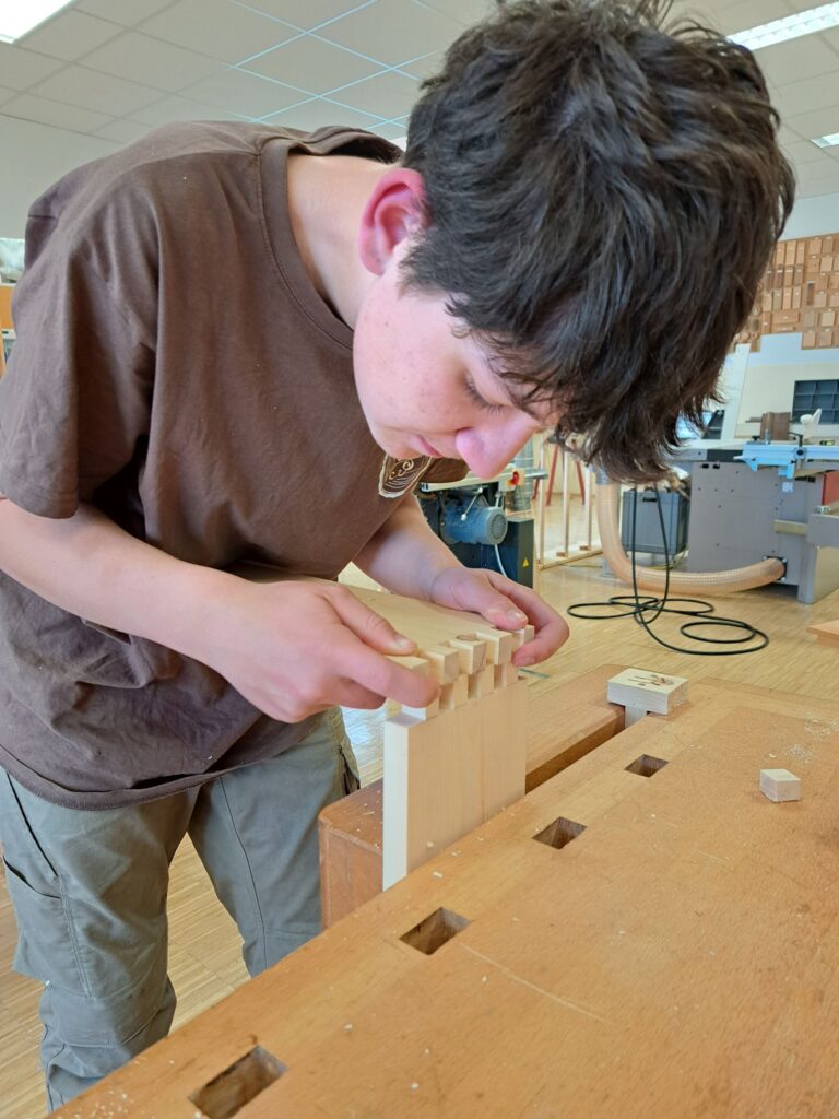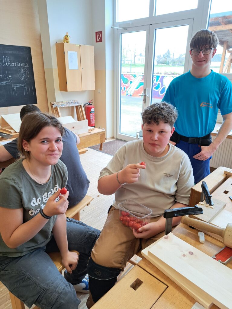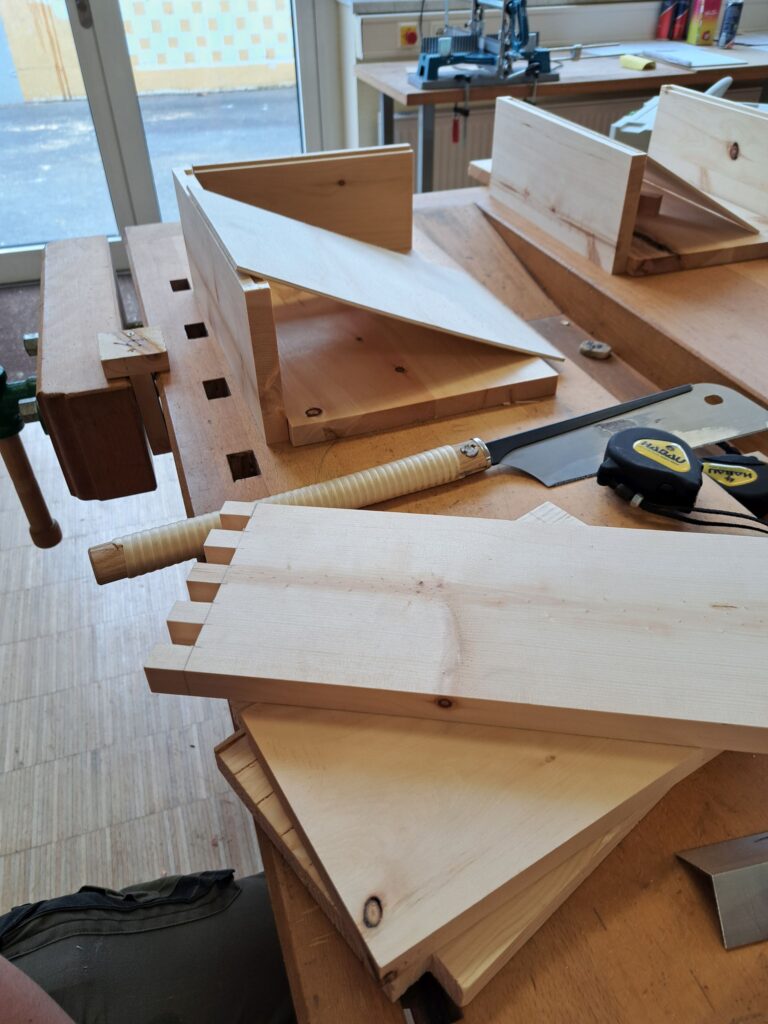 Neben unserem Fachabschlussstück, der Brotdose aus Zirbenholz, wird auch fleißig am Sozial-Projekt „Badestegerneuerung WG Engelsdorf“ gearbeitet. Während des Arbeitens wird auch sehr oft ins gratis Gemüsekistl der Volksbank gegriffen.