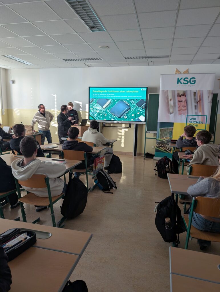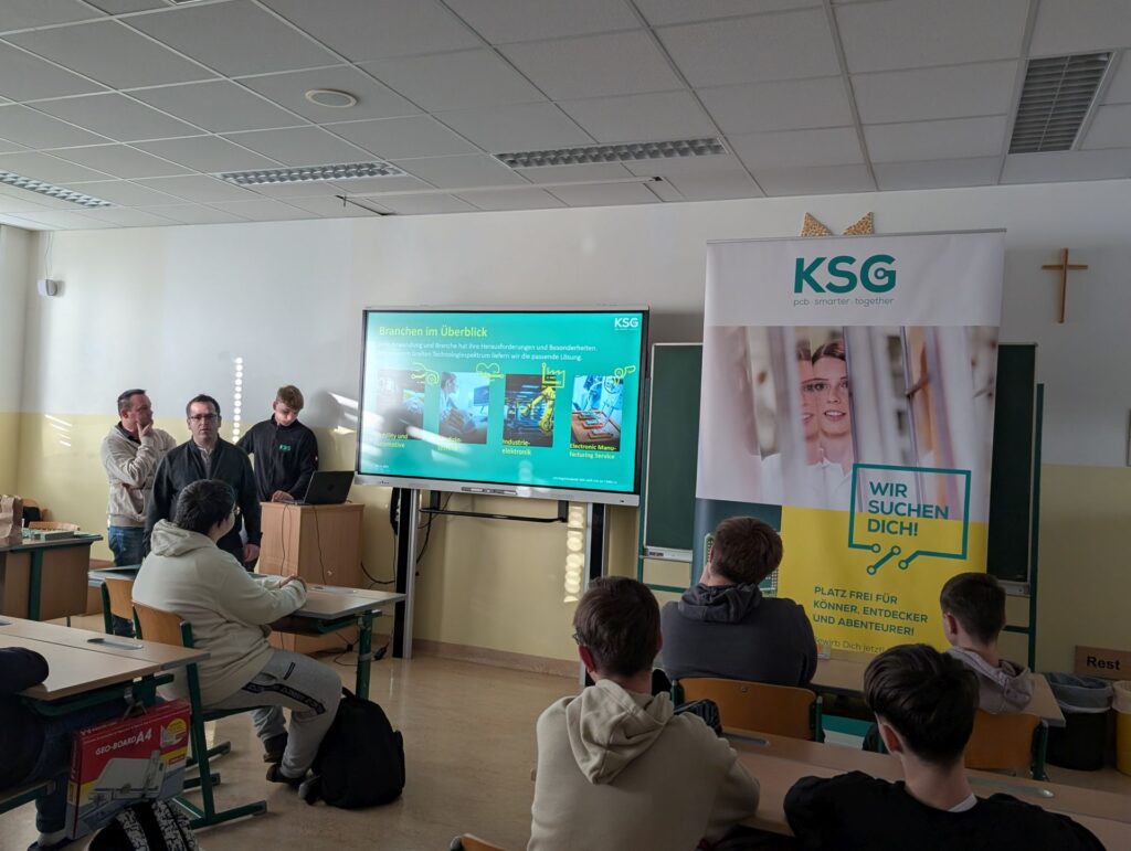 Hr. Arnberger, Lehrlingsausbilder bei KSG, präsentierte mit einem Mitarbeiter und einem Lehrling vor den angehenden Elektrikern, Metallern und Mechatronikern das Unternehmen KSG in Gars. Dabei erhielten sie einen interessanten Einblick in die Produkte des Unternehmens und deren Fertigung. Außerdem erfuhren sie viele Informationen zur Lehre im Unternehmen und über den Beruf des Prozesstechnikers. Wir bedanken uns für die informative Präsentation.